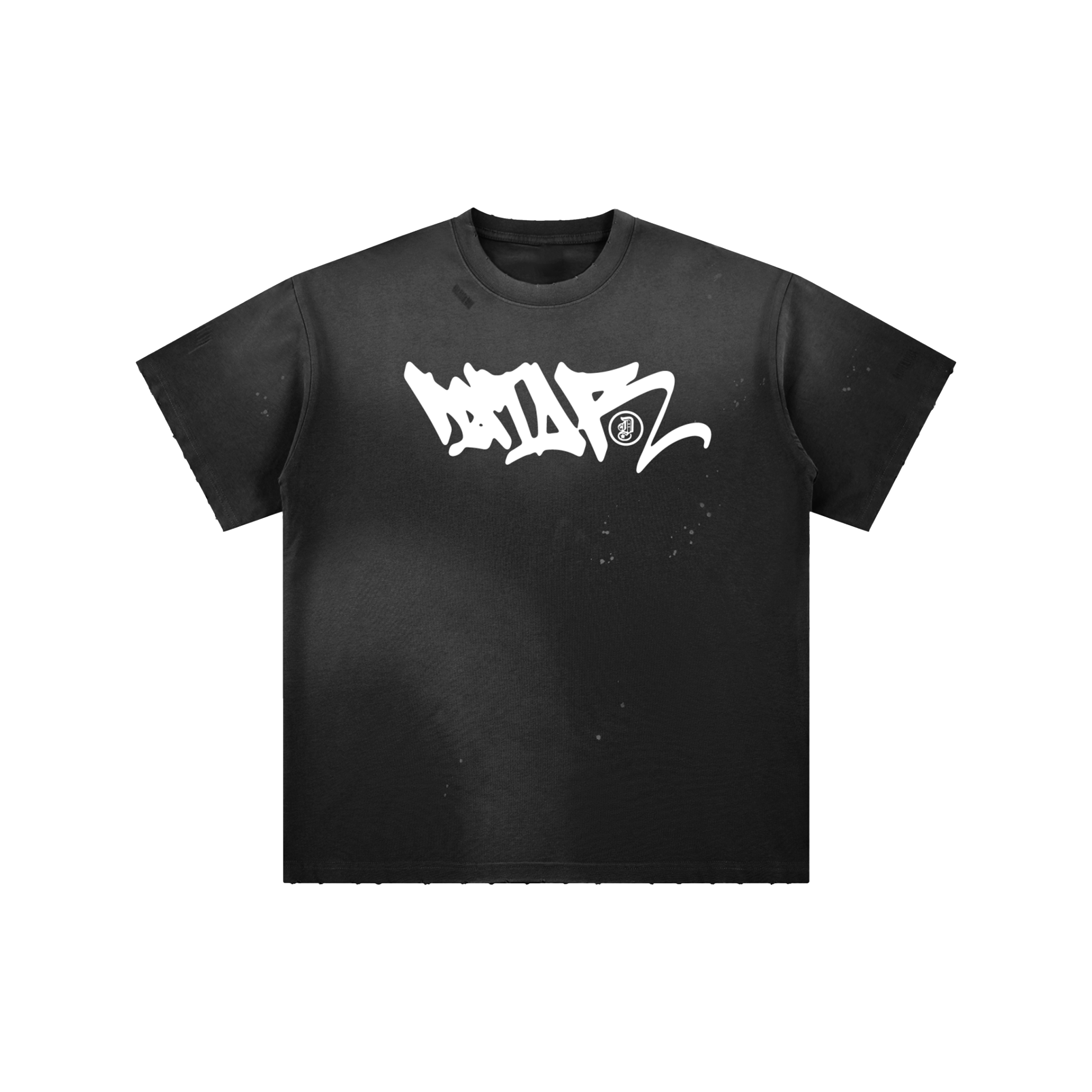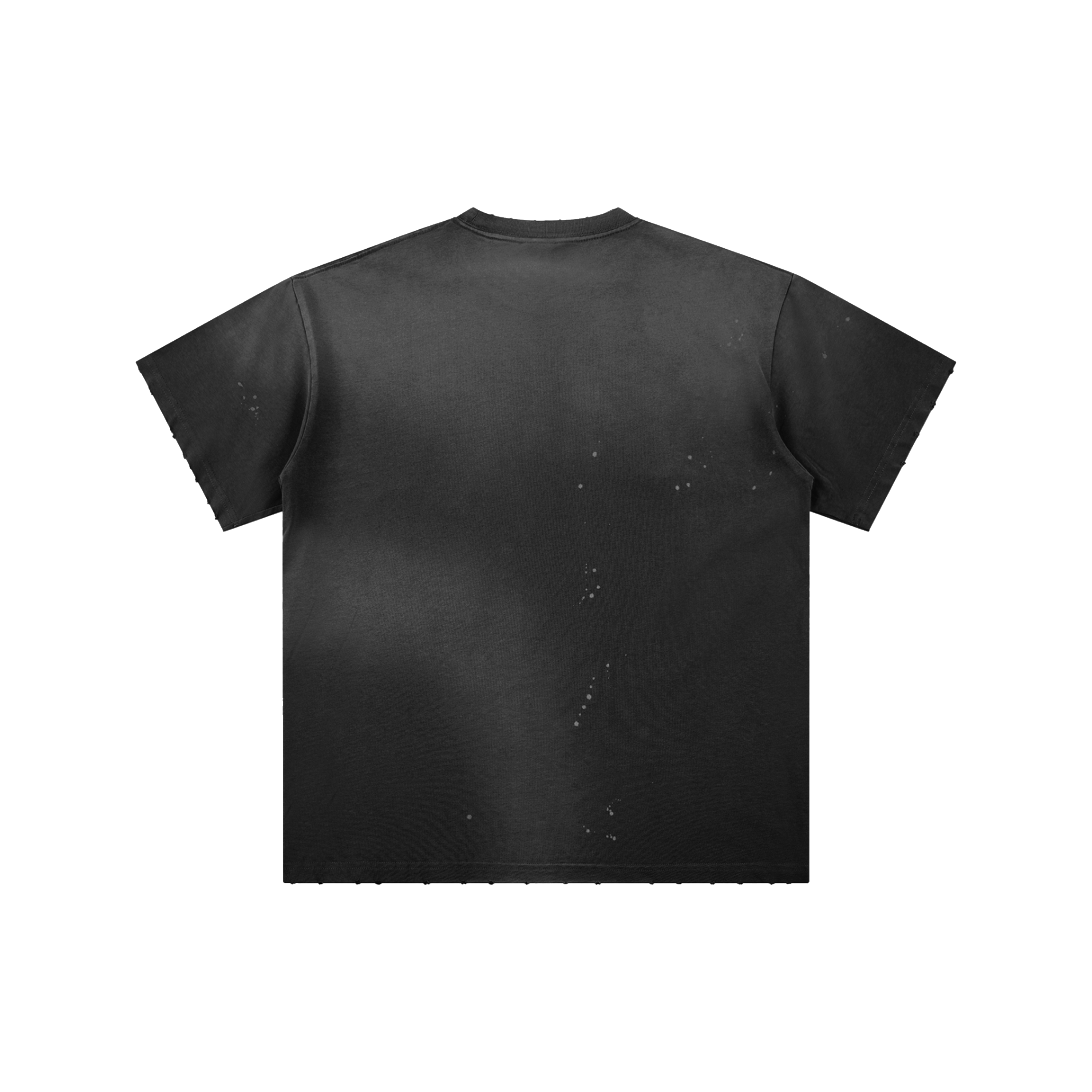 Graffiti Distressed Paint Splatter Tee is cut from 100% premium cotton, featuring a washed sunfade effect, raw edge distressing, and chaotic paint splatter accents. Individually hand-finished, no two pieces are ever identical—each garment carries its own character, shaped by process, not perfection. Bold in detail. Subtle in craftsmanship.